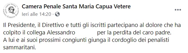 "Il Presidente, il Direttivo e tutti gli iscritti partecipano al dolore che ha colpito il collega Alessandro ... per la perdita del caro padre. A lui- si legge nella nota- e ai suoi prossimi congiunti giunga il cordoglio dei penalisti sammaritani."