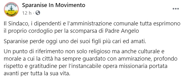 "Il Sindaco, i dipendenti e l'amministrazione comunale tutta esprimono il proprio cordoglio per la scomparsa di Padre Angelo ... Sparanise perde oggi uno dei suoi figli più cari ed amati. Un punto di riferimento non solo religioso ma anche culturale e morale a cui la città- si legge nella nota- ha sempre guardato con ammirazione, profondo rispetto e gratitudine per l’instancabile opera missionaria portata avanti per tutta la sua vita."