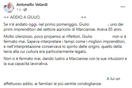 "Se n'è andato oggi, nel primo pomeriggio, Giulio ... , uno dei primi imprenditori del settore agricolo di Marcianise. Aveva 85 anni, ... Molto silenzioso, poco propenso ai riflettori, Giulio ... non si è fermato mai. -Si legge nella nota- Sapeva interpretare i tempi come i migliori imprenditori, e nell'interpretazione conservava lo spirito delle origini, quello della terra alla cui cultura era particolarmente legato. -Si legge nella nota- Non si è fermato mai, dando lustro a Marcianise con le sue intuizioni e la sua capacità lavorativa ... A lui un affettuoso addio, ai familiari le più sentite condoglianze."