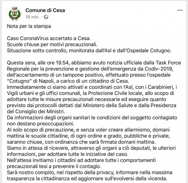 Questo quanto apprendiamo dalla pagina FB del Comune di Cesa