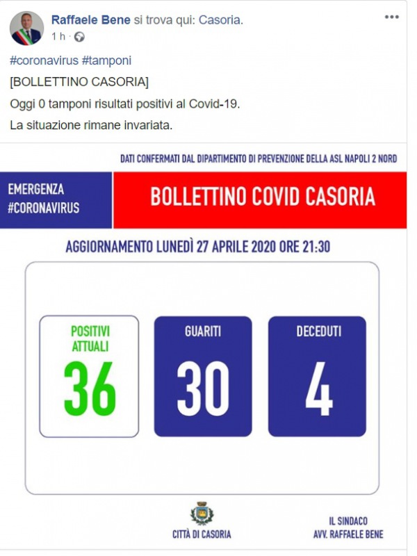 Questo quanto pubblicato sulla pagina facebook del Sindaco Bene: