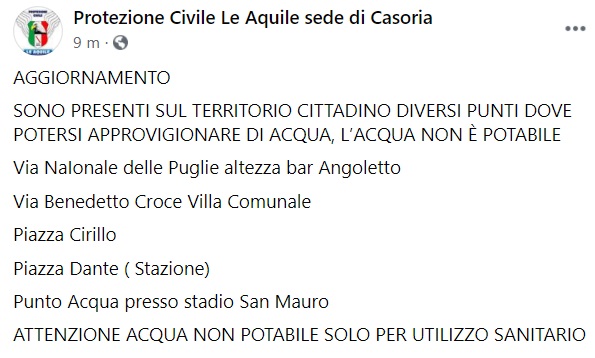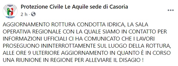 Questo quanto apprendiamo dalla pagina fb Protezione Civile Le Aquile sede di Casoria: "AGGIORNAMENTO ROTTURA CONDOTTA IDRICA, LA SALA OPERATIVA REGIONALE CON LA QUALE SIAMO IN CONTATTO PER INFORMAZIONI UFFICIALI CI HA COMUNICATO CHE I LAVORI PROSEGUONO ININTERROTTAMENTE SUL LUOGO DELLA ROTTURA, ALLE ORE 9 ULTERIORE AGGIORNAMENTO IN QUANTO È IN CORSO UNA RIUNIONE IN REGIONE PER ALLEVIARE IL DISAGIO! AGGIORNAMENTO SONO PRESENTI SUL TERRITORIO CITTADINO DIVERSI PUNTI DOVE POTERSI APPROVIGIONARE DI ACQUA, L’ACQUA NON È POTABILE Via NaIonale delle Puglie altezza bar Angoletto Via Benedetto Croce Villa Comunale Piazza Cirillo Piazza Dante ( Stazione) Punto Acqua presso stadio San Mauro ATTENZIONE ACQUA NON POTABILE SOLO PER UTILIZZO SANITARIO"