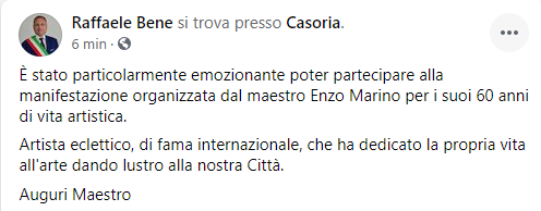 Questo il post pubblicato sulla sua pagina Facebook dal Sindaco di Casoria Raffaele Bene: "È stato particolarmente emozionante poter partecipare alla manifestazione organizzata dal maestro Enzo Marino per i suoi 60 anni di vita artistica. Artista eclettico - si legge nel post - di fama internazionale, che ha dedicato la propria vita all'arte dando lustro alla nostra Città. Auguri Maestro".