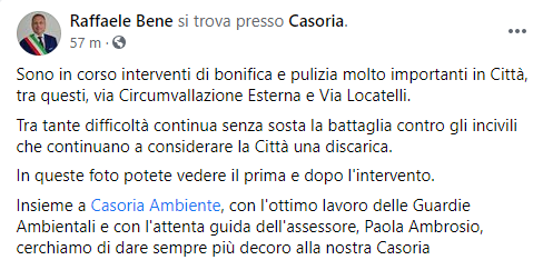 Questo il post pubblicato sulla sua pagina Facebook dal Sindaco di Casoria Raffaele Bene: "Sono in corso interventi di bonifica e pulizia molto importanti in Città, tra questi, via Circumvallazione Esterna e Via Locatelli. Tra tante difficoltà - si legge nel post - continua senza sosta la battaglia contro gli incivili che continuano a considerare la Città una discarica. In queste foto potete vedere il prima e dopo l'intervento. Insieme a Casoria Ambiente, con l'ottimo lavoro delle Guardie Ambientali e con l'attenta guida dell'assessore, Paola Ambrosio, cerchiamo - conclude il post - di dare sempre più decoro alla nostra Casoria".