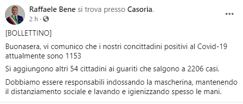 Questo il post pubblicato dal Sindaco di Casoria Raffaele Bene sulla sua pagina Facebook: "BOLLETTINO. Buonasera, vi comunico che i nostri concittadini positivi al Covid-19 attualmente sono 1153. Si aggiungono altri 54 cittadini ai guariti che salgono a 2206 casi. Dobbiamo essere responsabili - ha scritto il Sindaco nel post - indossando la mascherina, mantenendo il distanziamento sociale e lavando e igienizzando spesso le mani".