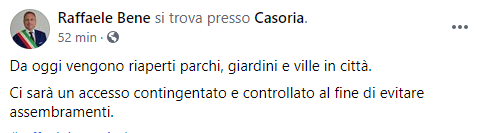 Questo il post pubblicato dal Sidaco di Casoria Raffaele Bene sulla sua pagina Facebook: "Da oggi vengono riaperti parchi, giardini e ville in città. Ci sarà un accesso contingentato - si legge nel post - e controllato al fine di evitare assembramenti".