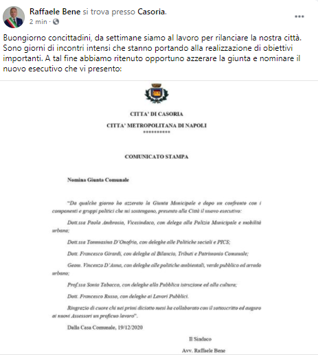 Questo il post pubblicato dal Sindaco di Casoria Raffaele Bene sulla sua pagina Facebook