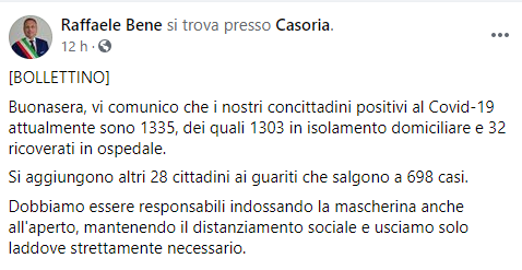 Questo il post Facebook del Sindaco di Casoria Raffaele Bene