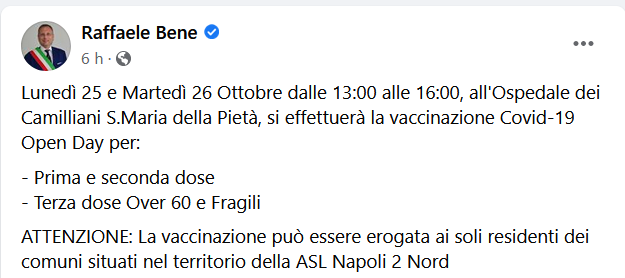 Questo il post pubblicato sulla pagina Facebook del sindaco di Casoria, Raffaele Bene: "Lunedì 25 e Martedì 26 Ottobre dalle 13:00 alle 16:00, all'Ospedale dei Camilliani S.Maria della Pietà, si effettuerà la vaccinazione Covid-19 Open Day per:- Prima e seconda dose; - Terza dose Over 60 e Fragili. ATTENZIONE: La vaccinazione può essere erogata ai soli residenti dei comuni situati nel territorio della ASL Napoli 2 Nord - conclude".