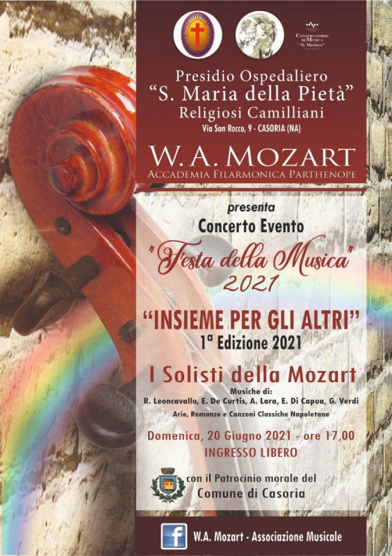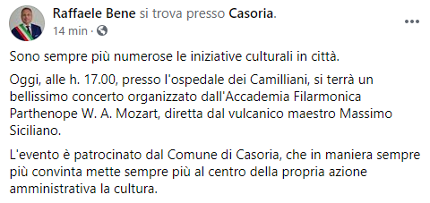 Questo il post pubblicato sulla sua pagina Facebook dal Sindaco di Casoria Raffaele Bene: "Sono sempre più numerose le iniziative culturali in città. Oggi, alle h. 17.00, presso l'ospedale dei Camilliani, si terrà un bellissimo concerto - si legge nel post - organizzato dall'Accademia Filarmonica Parthenope W. A. Mozart, diretta dal vulcanico maestro Massimo Siciliano. L'evento è patrocinato dal Comune di Casoria, che - prosegue il post - in maniera sempre più convinta mette sempre più al centro della propria azione amministrativa la cultura".