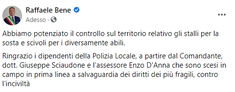 Questo parte del post pubblicato sulla sua pagina Facebook dal Sindaco di Casoria Raffaele Bene: "Abbiamo potenziato il controllo sul territorio relativo gli stalli per la sosta e scivoli per i diversamente abili. Ringrazio - si legge nel post - i dipendenti della Polizia Locale, a partire dal Comandante, dott. Giuseppe Sciaudone e l'assessore Vincenzo D'Anna che sono scesi in campo in prima linea a salvaguardia dei diritti dei più fragili, contro l'inciviltà (...)".