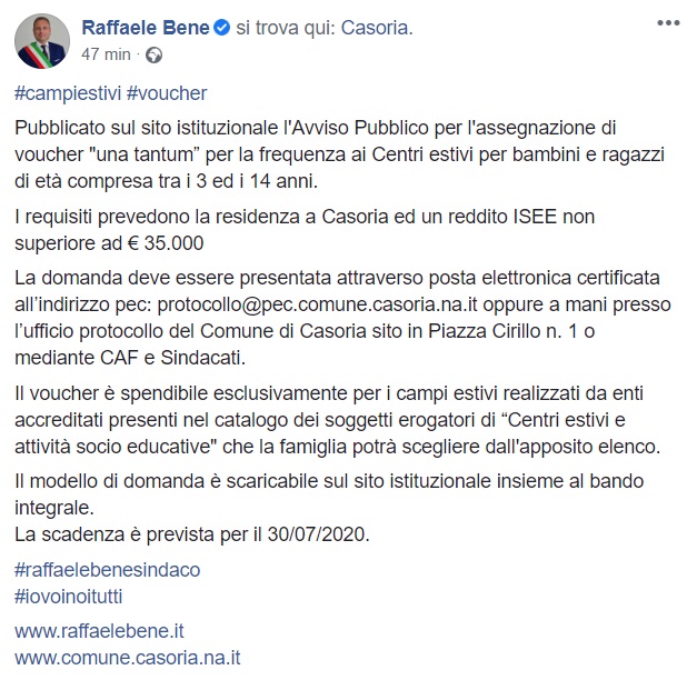 Questo quanto apprendiamo dalla pagina facebook del Sindaco Bene: