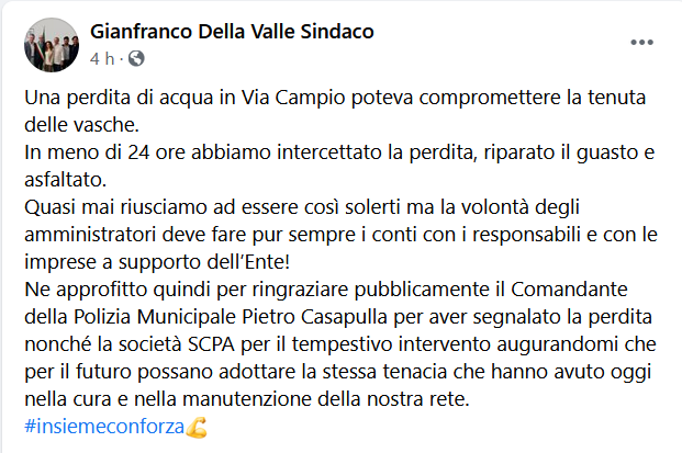 Ne approfitto quindi per ringraziare pubblicamente il Comandante della Polizia Municipale Pietro Casapulla per aver segnalato la perdita nonché la società SCPA per il tempestivo intervento augurandomi che per il futuro - conclude il post - possano adottare la stessa tenacia che hanno avuto oggi nella cura e nella manutenzione della nostra rete".