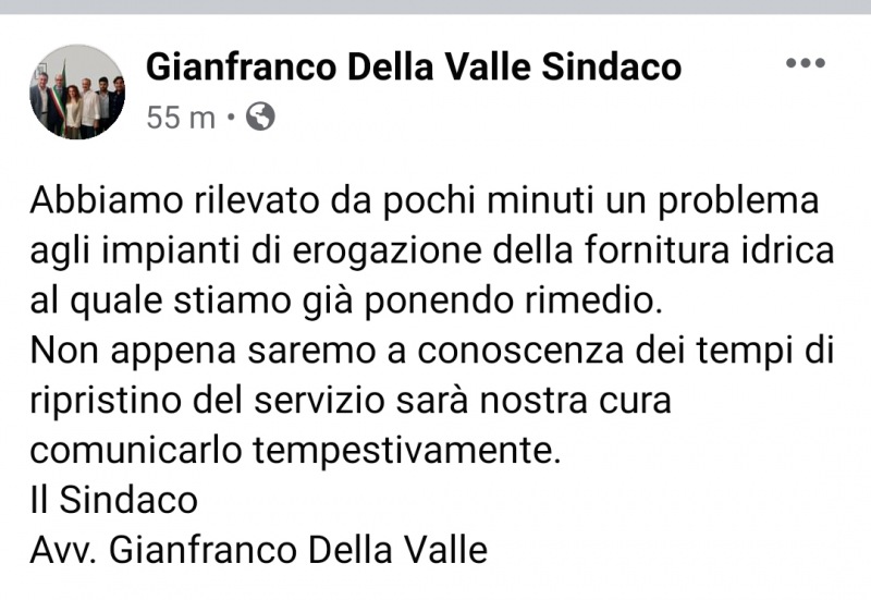 "Abbiamo rilevato da pochi minuti un problema agli impianti di erogazione della fornitura idrica al quale stiamo già ponendo rimedio. Non appena saremo a conoscenza dei tempi di ripristino del servizio sarà nostra cura comunicarlo tempestivamente."