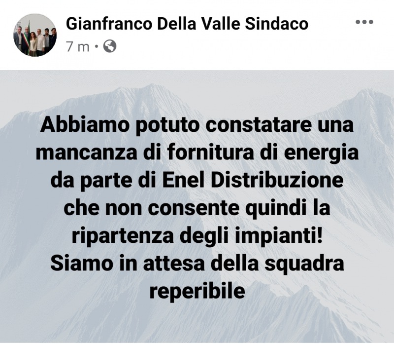 "Abbiamo potuto constatare una mancanza di fornitura di energia da parte di Enel Distribuzione che non consente quindi la ripartenza degli impianti! Siamo in attesa della squadra reperibile".