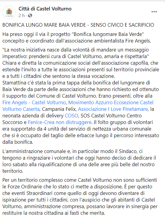 Questo il post pubblicato sulla pagina Facebook "Città di Castel Volturno":"Ha preso oggi il via il progetto "Bonifica lungomare Baia Verde" concepito e coordinato dall'associazione ambientalista Fire Angels. "La nostra iniziativa - si legge nel post - nasce dalla volontà di mandare un messaggio imperativo: prendersi cura di Castel Volturno, amarla e rispettarla" Chiara e diretta la comunicazione social dell'associazione capofila, che estende l'invito a tutte le associazioni presenti sul territorio provinciale e a tutti i cittadini che sentono la stessa vocazione. Stamattina - prosegue ancora il post - c'è stata la prima tappa della bonifica del lungomare di Baia Verde da parte delle associazioni che hanno richiesto ed ottenuto il supporto del Comune di Castel Volturno. Erano presenti (...). Il folto gruppo di volontari - ancora si legge nel post - era supportato da 4 unità del servizio di nettezza urbana comunale che si è occupato del taglio delle erbacce lungo il percorso interessato dalla bonifica. L'amministrazione comunale e, in particolar modo il Sindaco, ci tengono a ringraziare i volontari che oggi hanno deciso di dedicare il loro sabato alla riqualificazione di una delle aree più belle del nostro territorio. Per un territorio complesso come Castel Volturno non sono sufficienti le Forze Ordinarie che lo stato ci mette a disposizione - si legge nel post pubblicato su Facebook. È per questo che eventi Straordinari come quello di oggi devono diventare di ispirazione per tutti i cittadini, con l'auspicio che gli abitanti di Castel Volturno, amministrazione compresa, possano lavorare in sinergia per restituire la nostra cittadina ai fasti che merita" - conclude il post.