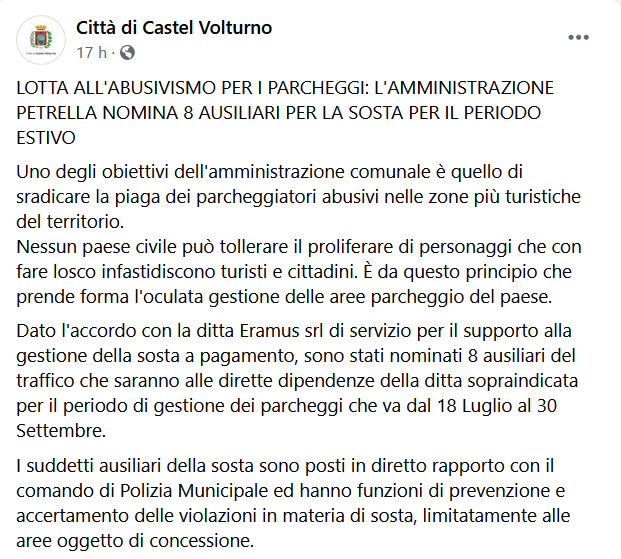 Questo il post pubblicato sulla pagina Facebook della Città di Castel Volturno: "Uno degli obiettivi dell'amministrazione comunale è quello di sradicare la piaga dei parcheggiatori abusivi nelle zone più turistiche del territorio. Nessun paese civile può tollerare il proliferare di personaggi che con fare losco infastidiscono turisti e cittadini. È da questo principio - si legge nel post - che prende forma l'oculata gestione delle aree parcheggio del paese. Dato l'accordo con la ditta Eramus srl di servizio per il supporto alla gestione della sosta a pagamento, sono stati nominati 8 ausiliari del traffico che saranno alle dirette dipendenze della ditta sopraindicata per il periodo di gestione dei parcheggi che va dal 18 Luglio al 30 Settembre. I suddetti ausiliari della sosta - conclude il post - sono posti in diretto rapporto con il comando di Polizia Municipale ed hanno funzioni di prevenzione e accertamento delle violazioni in materia di sosta, limitatamente alle aree oggetto di concessione.