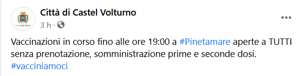 Questo il post pubblicato sulla pagina Facebook della Città di Castel Volturno: "Vaccinazioni in corso - si legge - fino alle ore 19:00 a Pinetamare aperte a TUTTI senza prenotazione, somministrazione prime e seconde dosi. Vacciniamoci - conclude".