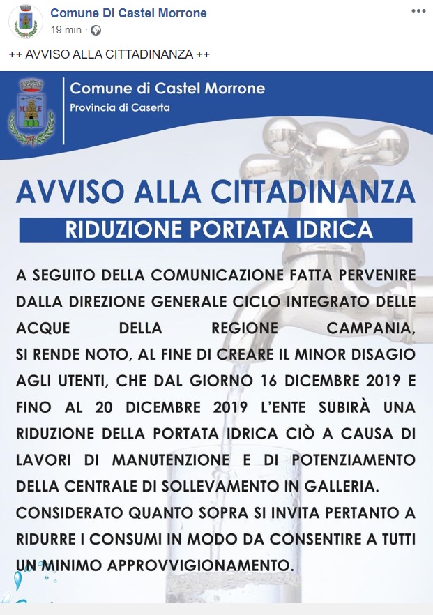 Questo quanto pubblicato sulla pagina facebook del Comune di Castel Morrone: