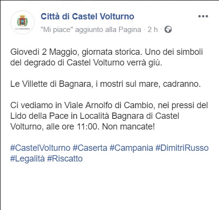 Questo quanto apprendiamo dal profilo FB del Comune di Castel Volturno