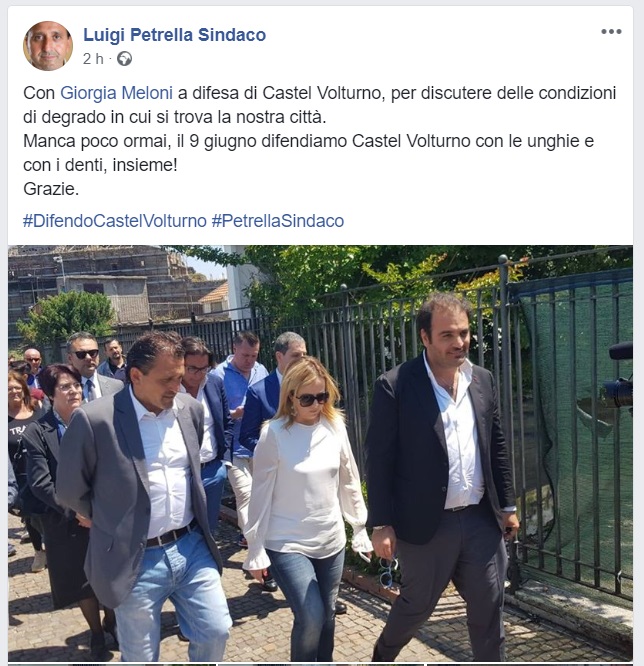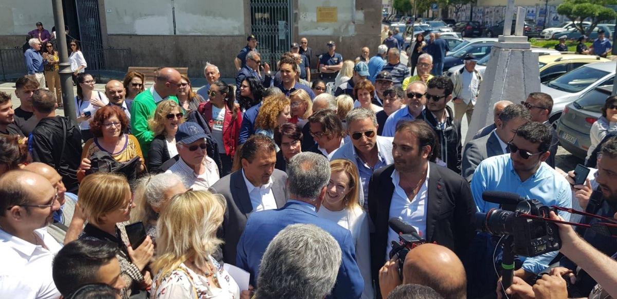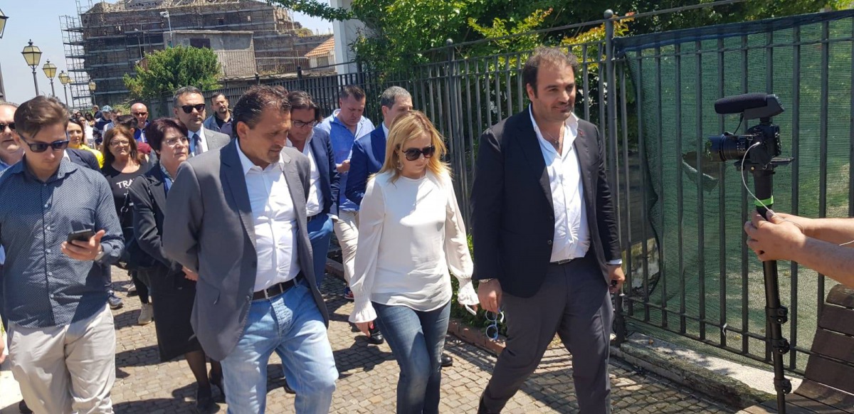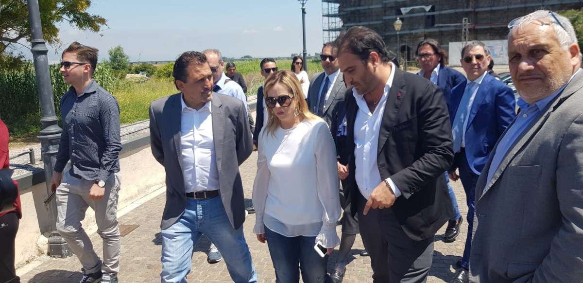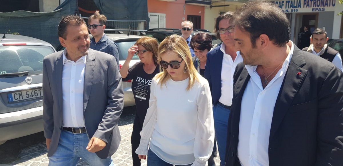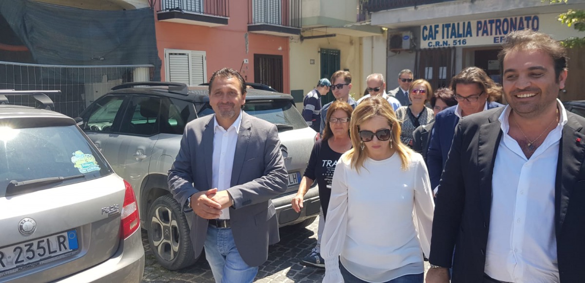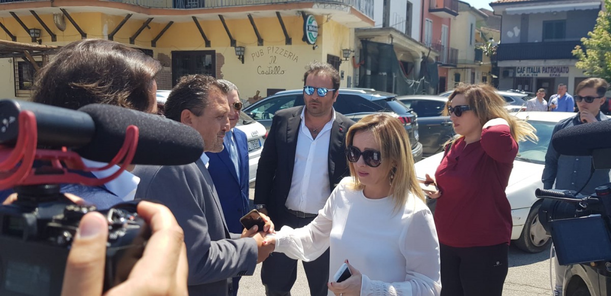 La leader di Fratelli d'Italia questa mattina è stata a Castel Volturno per sostenere il candidato di Fdi quale Sindaco della città al ballottaggio del prossimo 9 giugno
