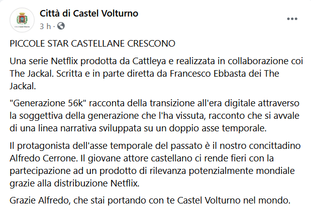 Questo il post pubblicato dalla pagina Facebook del Comune di Castel Volturno: "Una serie Netflix prodotta da Cattleya e realizzata in collaborazione coi The Jackal. Scritta - si legge - e in parte diretta da Francesco Ebbasta dei The Jackal. "Generazione 56k" racconta della transizione all'era digitale attraverso la soggettiva della generazione che l'ha vissuta, racconto che si avvale di una linea narrativa sviluppata su un doppio asse temporale. Il protagonista dell'asse temporale del passato - si legge nel post - è il nostro concittadino Alfredo Cerrone. Il giovane attore castellano ci rende fieri con la partecipazione ad un prodotto di rilevanza potenzialmente mondiale grazie alla distribuzione Netflix. Grazie Alfredo, che stai portando con te Castel Volturno nel mondo".