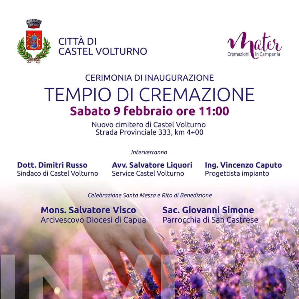 Il Sindaco di Castel Volturno Dimitri Russo, l'avvocato Salvatore Liquori e l'ingegnere Vincenzo Caputo, parteciperanno all'inaugurazione del "Tempio di Cremazione" presso il cimitero del comune litorale. Celebreranno la Santa Messa Mons. Salvatore Visco e il Sac. Giovanni Simone.