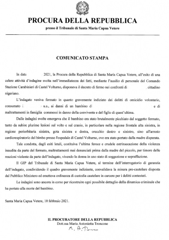 Questo parte del testo della nota inviataci dalla Procura della Repubblica presso il Tribunale di Santa Maria Capua Vetere: