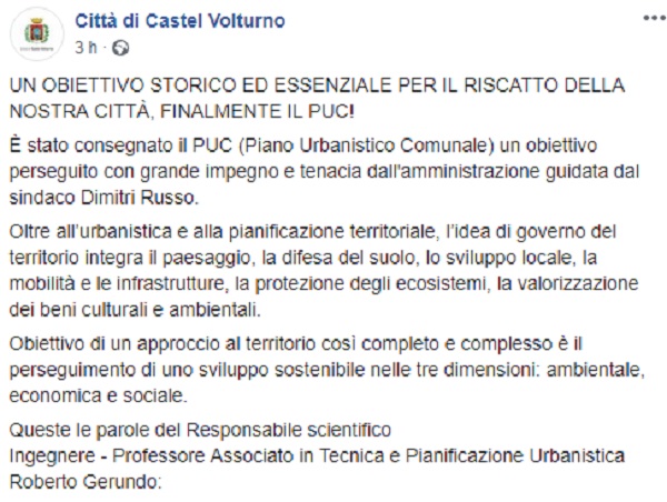 Questp il post pubblicato sulla pagina fb 'Città di Castel Volturno'