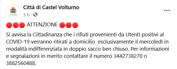 Questo il post pubblicato sulla pagina Facebook della Città di Castel Volturno: "Si avvisa la Cittadinanza che i rifiuti provenienti da Utenti positivi al COVID-19 verranno ritirati a domicilio esclusivamente il mercoledì in modalità indifferenziata in doppio sacco ben chiuso. Per informazioni e segnalazioni in merito - conclude - contattare il numero 3442738270 o 3882560488.