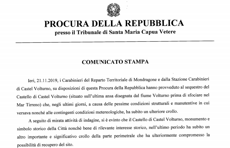 Castel Volturno. Sequestrato il Castello a causa di un importante e significativo crollo