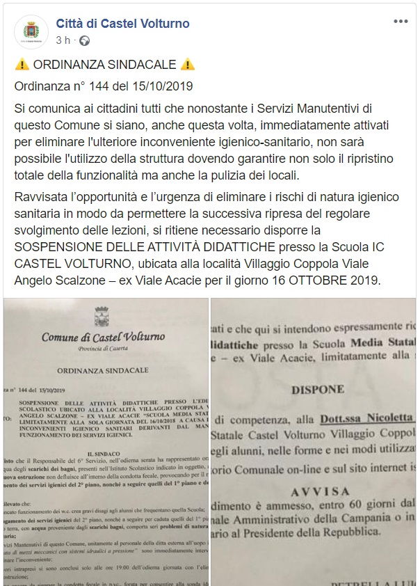 Questo quanto apprendiamo dalla pagina FB del Comune di Castel Volturno