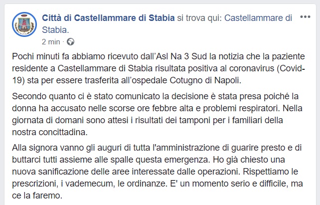 Questo quanto apprendiamo dalla pagina FB del Comune di Castellammare di Stabia