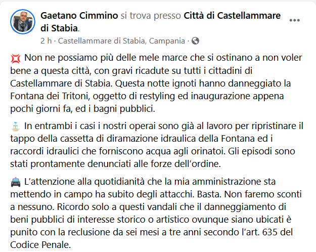 Questo il post pubblicato sulla pagina Facebook del sindaco di Castellammare di Stabia, Gaetano Cimmino. "Non ne possiamo più delle mele marce che si ostinano a non voler bene a questa città, con gravi ricadute su tutti i cittadini di Castellammare di Stabia. Questa notte ignoti hanno danneggiato la Fontana dei Tritoni, oggetto di restyling ed inaugurazione appena pochi giorni fa, ed i bagni pubblici. In entrambi i casi - si legge nel post - i nostri operai sono già al lavoro per ripristinare il tappo della cassetta di diramazione idraulica della Fontana ed i raccordi idraulici che forniscono acqua agli orinatoi. Gli episodi sono stati prontamente denunciati alle forze dell’ordine. L’attenzione - prosegue il post - alla quotidianità che la mia amministrazione sta mettendo in campo ha subito degli attacchi. Basta. Non faremo sconti a nessuno. Ricordo solo a questi vandali che il danneggiamento di beni pubblici di interesse storico o artistico ovunque siano ubicati è punito con la reclusione da sei mesi a tre anni secondo l’art. 635 del Codice Penale".