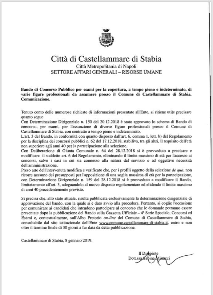 "Dal giorno in cui è stato pubblicato lo schema del bando di concorso per 21 assunzioni presso il Comune di Castellammare di Stabia, siamo inondati da richieste di informazioni, molte delle quali fanno riferimento alle modalità di presentazione della domanda per partecipare al concorso pubblico.-spiega la nota-Ci tengo pertanto a precisare un aspetto: il bando non è ancora stato pubblicato.La determina dirigenziale n° 150 del 20 dicembre 2018 fa riferimento esclusivamente all’approvazione dello schema di bando di concorso, per esami, di 21 figure professionali di categoria C e D presso l’Ente. Un’ulteriore determina dirigenziale,-spiega la nota- che fa seguito ad apposita delibera di giunta, è servita ad eliminare anche il limite di età previsto soltanto per casi correlati alla natura del servizio o per oggettive necessità dell’amministrazione. In pratica, tutti quelli che dispongono dei requisitirelativi ai profili richiesti potranno partecipare al concorso.-spiega la nota-Si tratta di una svolta storica per Castellammare, dato che i concorsi pubblici mancavano da decenni. E il fermento che si avverte in città ci riempie di entusiasmo. Siamo convinti che le nuove assunzioni potranno dare linfa ad una macchina comunale che necessita da tempo di forze fresche, da destinare a settori che da troppi anni vanno a rilento a causa della carenza di personale.-si legge nella nota-Il bando è ormai prossimo ad essere pubblicato e una cosa è certa: i concorsi saranno effettuati con la massima trasparenza e gli unici criteri che faranno fede sono il merito e la competenza."