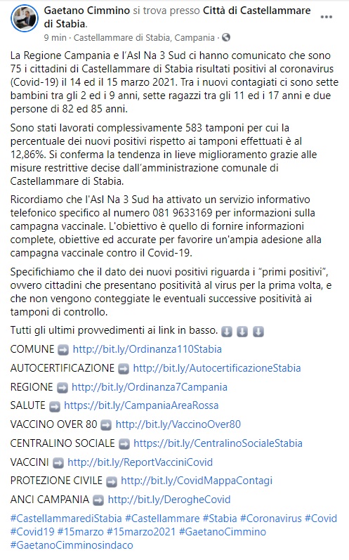 "La Regione Campania e l’Asl Na 3 Sud ci hanno comunicato che sono 75 i cittadini di Castellammare di Stabia risultati positivi al coronavirus (Covid-19) il 14 ed il 15 marzo 2021. Tra i nuovi contagiati ci sono sette bambini tra gli 2 ed i 9 anni, sette ragazzi tra gli 11 ed i 17 anni e due persone di 82 ed 85 anni. Sono stati lavorati complessivamente 583 tamponi per cui la percentuale dei nuovi positivi rispetto ai tamponi effettuati è al 12,86%. Si conferma la tendenza in lieve miglioramento grazie alle misure restrittive decise dall’amministrazione comunale di Castellammare di Stabia. Ricordiamo che l'Asl Na 3 Sud ha attivato un servizio informativo telefonico specifico al numero 081 9633169 per informazioni sulla campagna vaccinale. L'obiettivo è quello di fornire informazioni complete, obiettive ed accurate per favorire un'ampia adesione alla campagna vaccinale contro il Covid-19. Specifichiamo che il dato dei nuovi positivi riguarda i “primi positivi”, ovvero cittadini che presentano positività al virus per la prima volta, e che non vengono conteggiate le eventuali successive positività ai tamponi di controllo. Tutti gli ultimi provvedimenti ai link in basso. COMUNE http://bit.ly/Ordinanza110Stabia AUTOCERTIFICAZIONE http://bit.ly/AutocertificazioneStabia REGIONE http://bit.ly/Ordinanza7Campania SALUTE https://bit.ly/CampaniaAreaRossa VACCINO OVER 80 http://bit.ly/VaccinoOver80 CENTRALINO SOCIALE https://bit.ly/CentralinoSocialeStabia VACCINI http://bit.ly/ReportVacciniCovid PROTEZIONE CIVILE http://bit.ly/CovidMappaContagi ANCI CAMPANIA http://bit.ly/DerogheCovid"