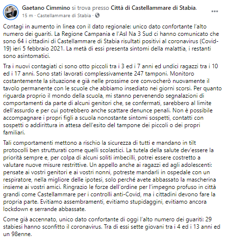 Questo il post pubblicato dal Sindaco di Castellammare di Stabia Gaetano Cimmino sulla sua pagina Facebook: "Contagi in aumento in linea con il dato regionale: unico dato confortante l’alto numero dei guariti. La Regione Campania e l’Asl Na 3 Sud ci hanno comunicato che sono 64 i cittadini di Castellammare di Stabia risultati positivi al coronavirus (Covid-19) ieri 5 febbraio 2021. La metà di essi presenta sintomi della malattia, i restanti sono asintomatici. Tra i nuovi contagiati - si legge nella nota - ci sono otto piccoli tra i 3 ed i 7 anni ed undici ragazzi tra i 10 ed i 17 anni. Sono stati lavorati complessivamente 247 tamponi. Monitoro costantemente la situazione e già nelle prossime ore convocherò nuovamente il tavolo permanente - continua la nota - con le scuole che abbiamo insediato nei giorni scorsi. Per quanto riguarda proprio il mondo della scuola, mi stanno pervenendo segnalazioni di comportamenti da parte di alcuni genitori che, se confermati, sarebbero al limite dell’assurdo e per cui potrebbero anche scattare denunce penali. Non è possibile accompagnare i propri figli a scuola nonostante sintomi sospetti, contatti con sospetti o addirittura in attesa dell’esito del tampone dei piccoli o dei propri familiari. Tali comportamenti mettono a rischio la sicurezza di tutti e mandano in tilt protocolli ben strutturati come quelli scolastici. La tutela della salute dev’essere la priorità sempre e, per colpa di alcuni soliti imbecilli, potrei essere costretto a valutare nuove misure restrittive. Un appello - continua il post - anche ai ragazzi ed agli adolescenti: pensate ai vostri genitori e ai vostri nonni, potreste mandarli in ospedale con un respiratore, nella migliore delle ipotesi, solo perché avete abbassato la mascherina insieme ai vostri amici. Ringrazio le forze dell’ordine per l’impegno profuso in città grandi come Castellammare per i controlli anti-Covid, ma i cittadini devono fare la propria parte. Evitiamo assembramenti - conclude il Sindaco - evitiamo stupidaggini, evitiamo ancora lockdown e serrande abbassate. Come già accennato, unico dato confortante di oggi l’alto numero dei guariti: 29 stabiesi hanno sconfitto il coronavirus. Tra di essi sette giovani tra i 4 ed i 13 anni ed un 98enne".