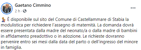 Questo il post pubblicato dal Sindaco di Castellammare di Stabia Gaetano Cimmino sulla sua pagina Facebook: "È disponibile sul sito del Comune di Castellammare di Stabia la modulistica per richiedere l'assegno di maternità. La domanda - si legge nel post - dovrà essere presentata dalla madre del neonato/a o dalla madre di bambini in affidamento preadottivo o in adozione. Le richieste dovranno pervenire entro sei mesi dalla data del parto - conclude il post - o dell'ingresso del minore in famiglia".