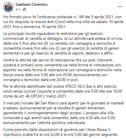 Questo il post pubblicato dal Sindaco di Castellammare di Stabia Gaetano Cimmino sulla sua pagina Facebook: "Ho firmato poco fa l’ordinanza sindacale n. 149 del 9 aprile 2021, con cui ho disposto le misure anti-Covid nella mia città da sabato 10 aprile 2021 fino a domenica 18 aprile 2021. Le principali novità - si legge nel post - riguardano le restrizioni per gli esercizi commerciali di vendita al dettaglio, la cui attività sarà estesa di un’ora, dalle ore 5 fino alle ore 20. La vendita con consegna a domicilio è consentita invece fino alle ore 22 per gli esercizi di vendita di generi alimentari e per gli esercizi di vendita di saponi, detersivi e affini. Inoltre - prosegue il Sindaco - le attività dei servizi di ristorazione (fra cui pub, ristoranti, pizzerie e similari) sono consentite sia nella forma di ristorazione con asporto sia nella forma di ristorazione con consegna a domicilio nella fascia oraria dalle ore 5.00 alle ore 20.00 (esclusivamente con consegna a domicilio dalle ore 20.00 in poi). Per le attività identificate dal codice ATECO 56.3 (bar e altri esercizi simili senza cucina) l'asporto è consentito dalle ore 5.00 alle ore 18.00 come da art. 46 DPCM 2 marzo 2021. Il mercato rionale del San Marco - si legge ancora - sarà aperto per le giornate di martedì e sabato, esclusivamente per la vendita di generi alimentari, garantendo il contingentamento degli accessi. L’accesso alla villa comunale e agli arenili sarà consentito dalle ore 6.30 alle ore 8.30, esclusivamente per l’attività sportiva individuale. Come previsto dalle disposizioni di governo per l'Area Rossa, il coprifuoco - conclude il Sindaco - scatta tra le ore 22.00 e le ore 5.00 del giorno seguente".