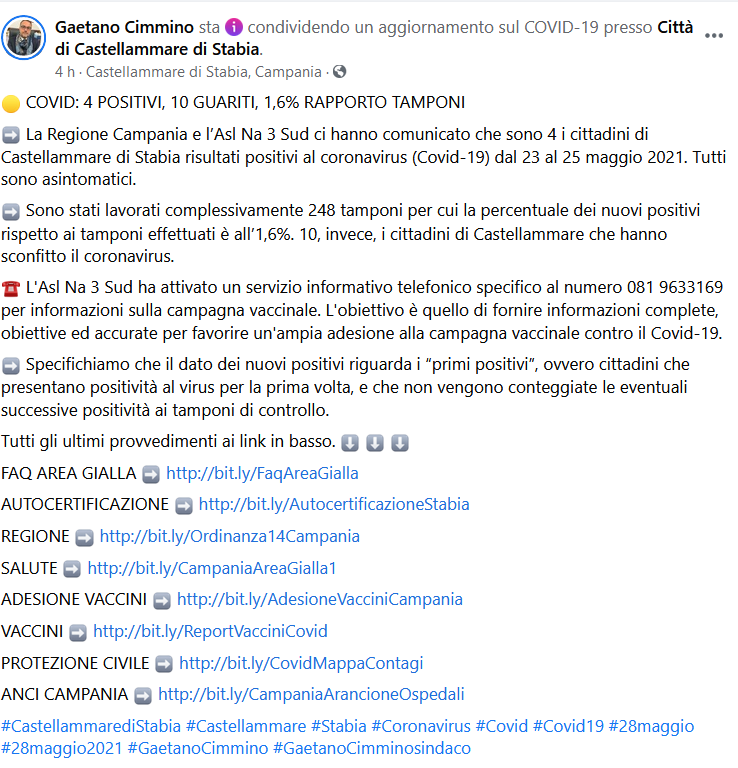 Questo il post pubblicato sulla pagina Facebook del sindaco di Castellammare di Stabia Gaetano Cimmino: "La Regione Campania e l’Asl Na 3 Sud ci hanno comunicato che sono 4 i cittadini di Castellammare di Stabia risultati positivi al coronavirus (Covid-19) dal 23 al 25 maggio 2021. Tutti sono asintomatici. Sono stati lavorati complessivamente - si legge nel post - 248 tamponi per cui la percentuale dei nuovi positivi rispetto ai tamponi effettuati è all’1,6%. 10, invece, i cittadini di Castellammare che hanno sconfitto il coronavirus. L'Asl Na 3 Sud ha attivato - recita ancora il post - un servizio informativo telefonico specifico al numero 081 9633169 per informazioni sulla campagna vaccinale. L'obiettivo è quello di fornire informazioni complete, obiettive ed accurate per favorire un'ampia adesione alla campagna vaccinale contro il Covid-19. Specifichiamo - conclude il post - che il dato dei nuovi positivi riguarda i “primi positivi”, ovvero cittadini che presentano positività al virus per la prima volta, e che non vengono conteggiate le eventuali successive positività ai tamponi di controllo".