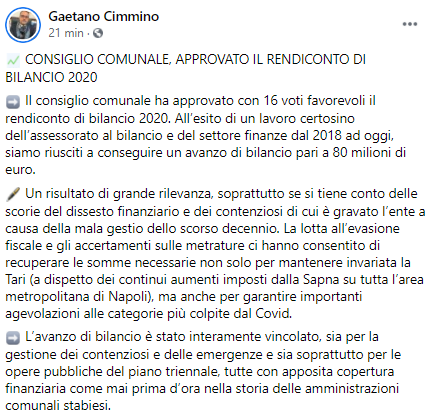 Questo il post pubblicato sulla sua pagina Facebook dal Sindaco di Castellammare di Stabia Gaetano Cimmino: "CONSIGLIO COMUNALE, APPROVATO IL RENDICONTO DI BILANCIO 2020. Il consiglio comunale ha approvato con 16 voti favorevoli il rendiconto di bilancio 2020. All’esito di un lavoro certosino dell’assessorato al bilancio - si legge nel post - e del settore finanze dal 2018 ad oggi, siamo riusciti a conseguire un avanzo di bilancio pari a 80 milioni di euro. Un risultato di grande rilevanza, soprattutto se si tiene conto delle scorie del dissesto finanziario e dei contenziosi di cui è gravato l’ente - prosegue il post - a causa della mala gestio dello scorso decennio. La lotta all’evasione fiscale e gli accertamenti sulle metrature ci hanno consentito di recuperare le somme necessarie non solo per mantenere invariata la Tari (a dispetto dei continui aumenti imposti dalla Sapna su tutta l’area metropolitana di Napoli), ma anche - si legge ancora - per garantire importanti agevolazioni alle categorie più colpite dal Covid. L’avanzo di bilancio è stato interamente vincolato, sia per la gestione dei contenziosi e delle emergenze e sia soprattutto per le opere pubbliche del piano triennale, tutte - conclude il post - con apposita copertura finanziaria come mai prima d’ora nella storia delle amministrazioni comunali stabiesi".