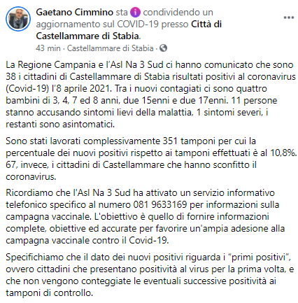 Questo parte del post pubblicato sulla sua pagina Facebook dal Sindaco di Castellammare Gaetano Cimmino: "La Regione Campania e l’Asl Na 3 Sud ci hanno comunicato che sono 38 i cittadini di Castellammare di Stabia risultati positivi al coronavirus (Covid-19) l’8 aprile 2021. Tra i nuovi contagiati ci sono quattro bambini di 3, 4, 7 ed 8 anni, due 15enni e due 17enni. 11 persone stanno accusando sintomi lievi della malattia, 1 sintomi severi, i restanti sono asintomatici. Sono stati lavorati - si legge nel post - complessivamente 351 tamponi per cui la percentuale dei nuovi positivi rispetto ai tamponi effettuati è al 10,8%. 67, invece, i cittadini di Castellammare che hanno sconfitto il coronavirus. Ricordiamo che l'Asl Na 3 Sud ha attivato un servizio informativo telefonico specifico al numero 081 9633169 per informazioni sulla campagna vaccinale. L'obiettivo - si legge ancora nel post - è quello di fornire informazioni complete, obiettive ed accurate per favorire un'ampia adesione alla campagna vaccinale contro il Covid-19. Specifichiamo che il dato dei nuovi positivi riguarda i “primi positivi”, ovvero cittadini che presentano positività al virus per la prima volta - conclude il post - e che non vengono conteggiate le eventuali successive positività ai tamponi di controllo (...)".