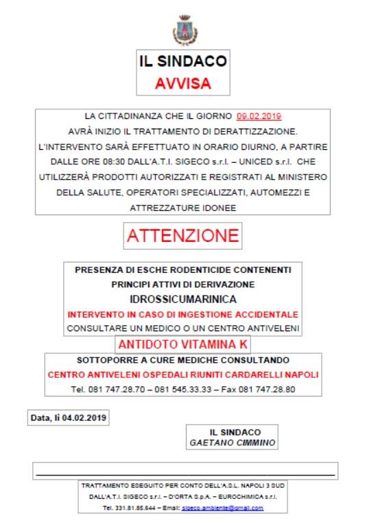 "Sabato 9 febbraio avrà inizio il trattamento di derattizzazione, che sarà effettuato in orario diurno a partire dalle ore 8.30. Avvisiamo la cittadinanza di fare attenzione alla presenza di esche rodenticide contenenti principi attivi di derivazione idrossicumarinica. In caso di ingestione accidentale, è necessario consultare un medico o un centro antiveleni."