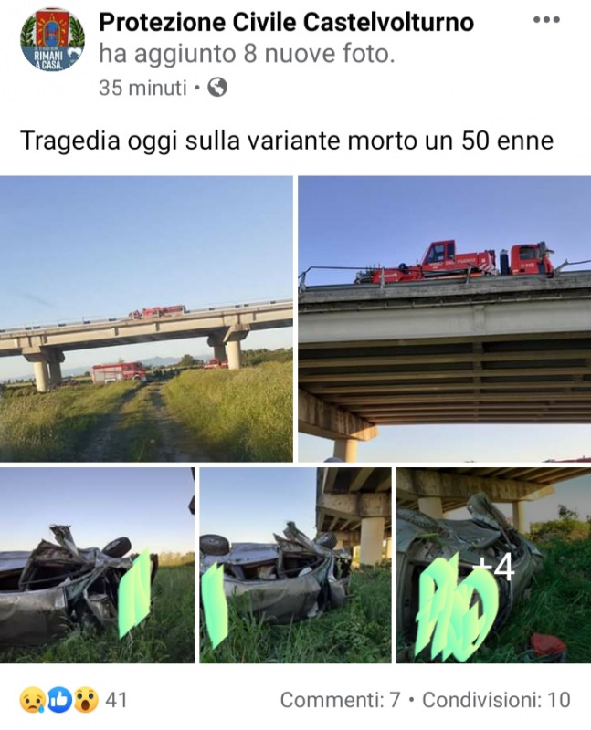 Apprendiamo dal profilo Facebook 'Protezione Civile Castelvolturno', di un brutto incidente automobilistico che sarebbe avvenuto oggi, all'altezza della Variante di Castelvolturno, che ha visto coinvolta un"automobile. Morta una persona. Non conosciamo la dinamica dell'incidente. Sul posto, anche i Vigili del Fuoco.