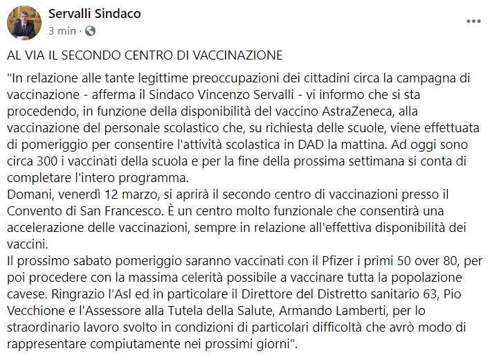 "AL VIA IL SECONDO CENTRO DI VACCINAZIONE. "In relazione alle tante legittime preoccupazioni dei cittadini circa la campagna di vaccinazione - afferma il Sindaco Vincenzo Servalli - vi informo che si sta procedendo, in funzione della disponibilità del vaccino AstraZeneca, alla vaccinazione del personale scolastico che, su richiesta delle scuole, viene effettuata- si legge nella nota- di pomeriggio per consentire l'attività scolastica in DAD la mattina. Ad oggi sono circa 300 i vaccinati della scuola e per la fine della prossima settimana si conta di completare l'intero programma. Domani, venerdì 12 marzo, si aprirà il secondo centro di vaccinazioni presso il Convento di San Francesco. È un centro molto funzionale che consentirà una accelerazione delle vaccinazioni, sempre in relazione all'effettiva disponibilità dei vaccini. Il prossimo sabato pomeriggio saranno vaccinati con il Pfizer i primi 50 over 80, per poi procedere con la massima celerità possibile a vaccinare- si legge nella nota- tutta la popolazione cavese. Ringrazio l'Asl ed in particolare il Direttore del Distretto sanitario 63, Pio Vecchione e l'Assessore alla Tutela della Salute, Armando Lamberti, per lo straordinario lavoro svolto in condizioni di particolari difficoltà che avrò modo di rappresentare compiutamente nei prossimi giorni"."