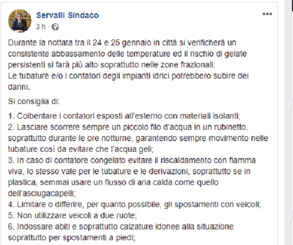 Questo il post pubblicato sulla pagina fb ufficiale del Sindaco di Cava de' Tirreni, Servalli.