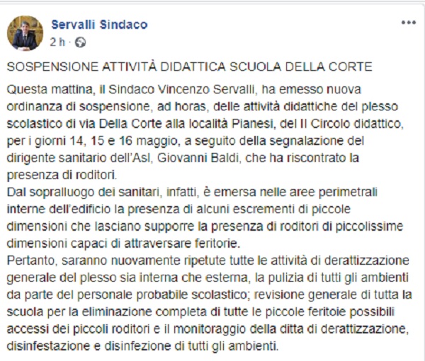 Questo il post pubblicato sulla pagina fb ufficiale del Sindaco di Cava de' Tirreni Servalli.