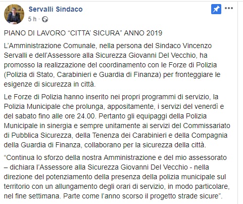 Questo il post pubblicato sulla pagina fb ufficiale del Sindaco di Cava de' Tirreni Servalli.