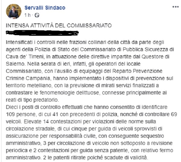 Questo il post pubbicato sulla pagina fb ufficiale del Sindaco di Cava de' Tirreni Servalli.