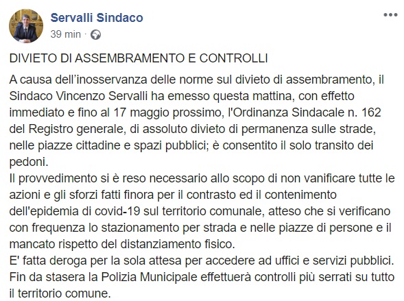 Questo quanto pubblicato sulla pagina facebook del Sindaco Servalli:
